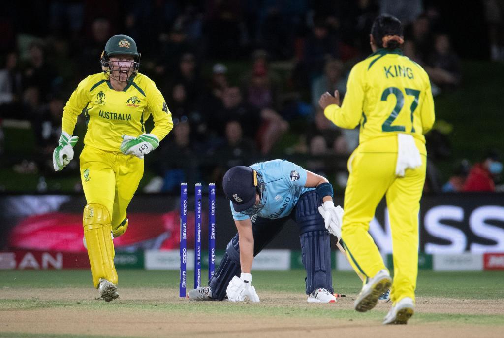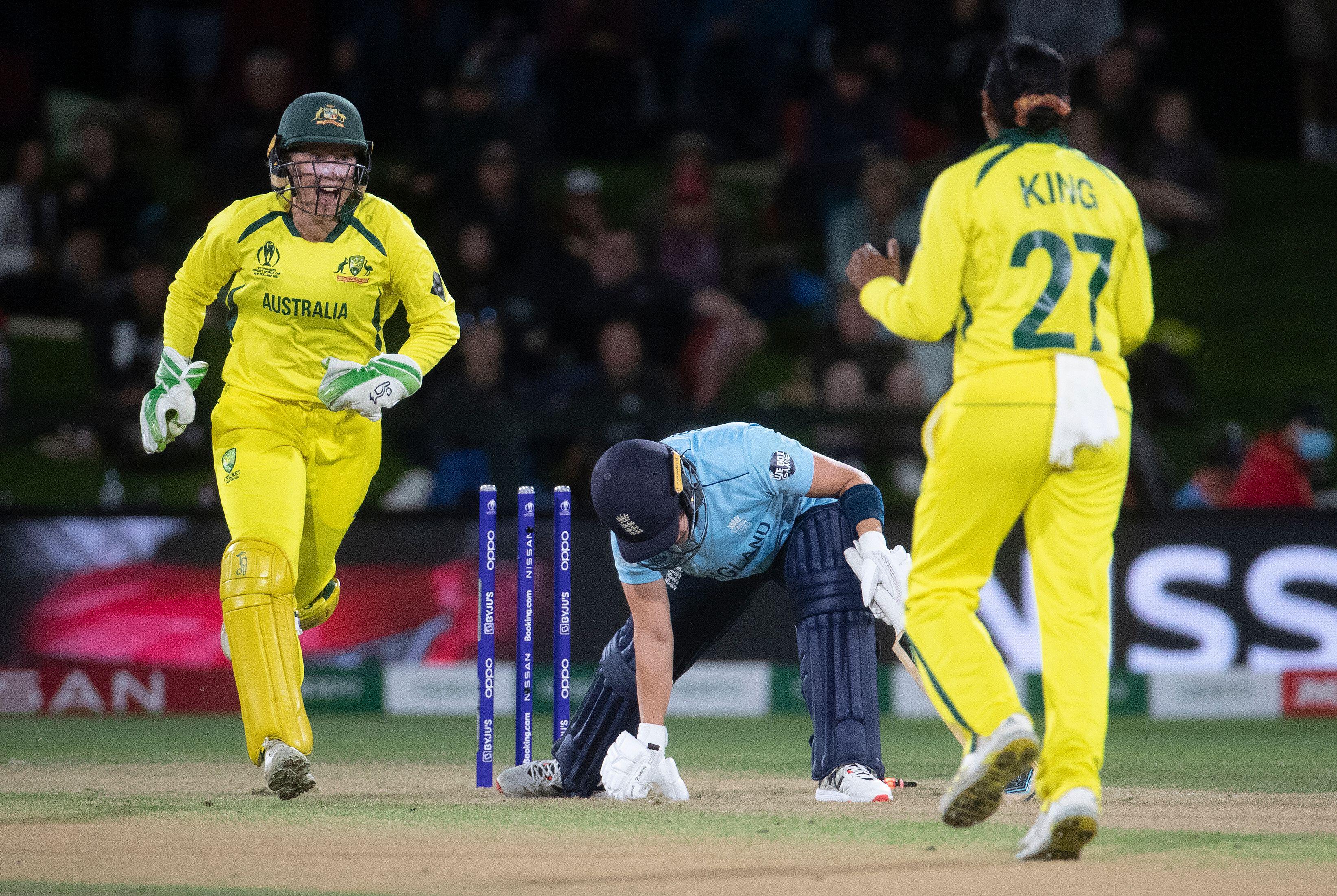 England’s Katherine Brunt stumped by Australia wicket keeper Alyssa Healy off the bowling of Emilia Surch’s favourite player Alana King during the ICC Women’s World Cup 2022 Final match at Hagley Oval, Christchurch..PA Images / Alamy Stock Photo