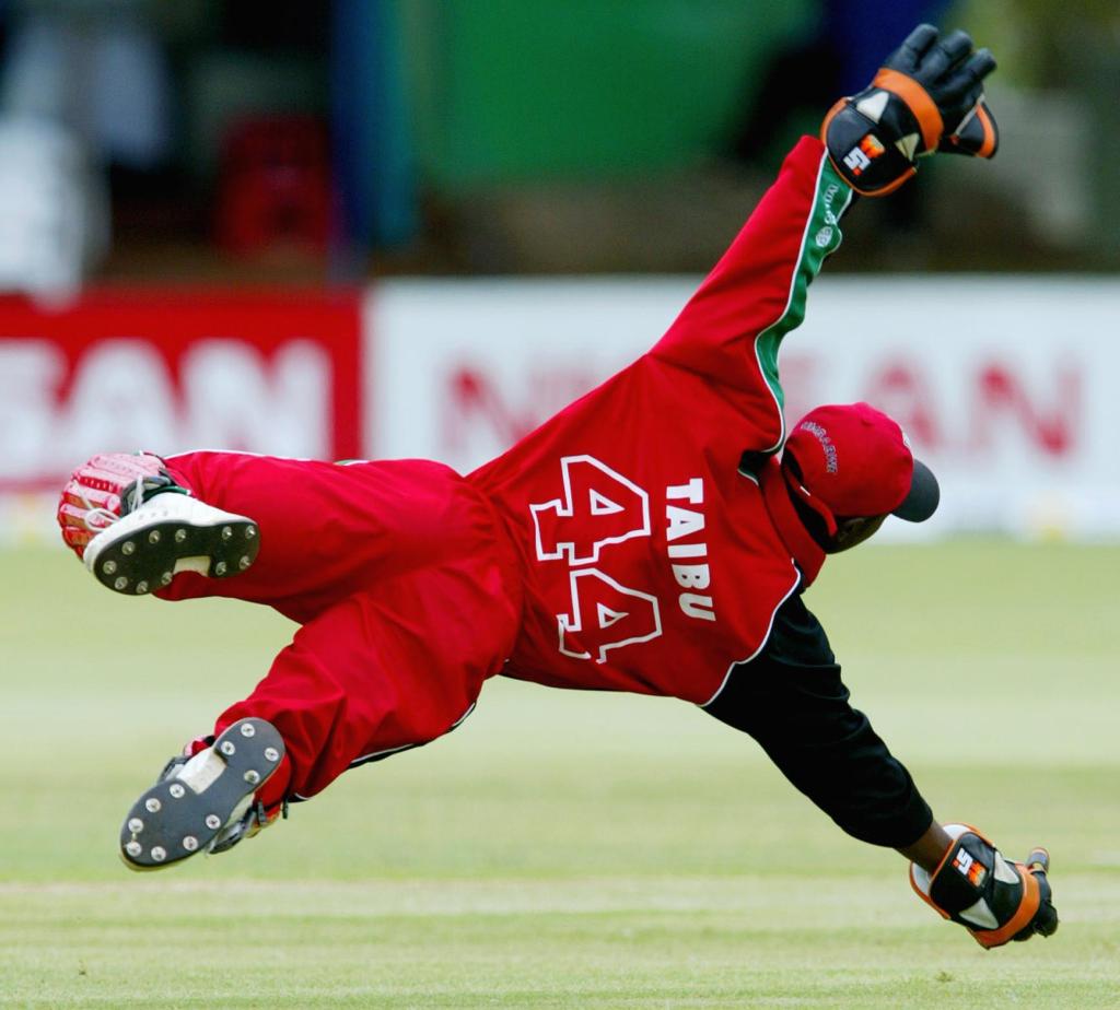 Zimbabwe Wicket-keeper and Captain Tatenda Taibu dives through the air as England take on Zimbabwe during the fourth one-day international match of the series between England and Zimbabwe at the Queens Sports Club, Bulawayo. PA / Alamy Stock Photo