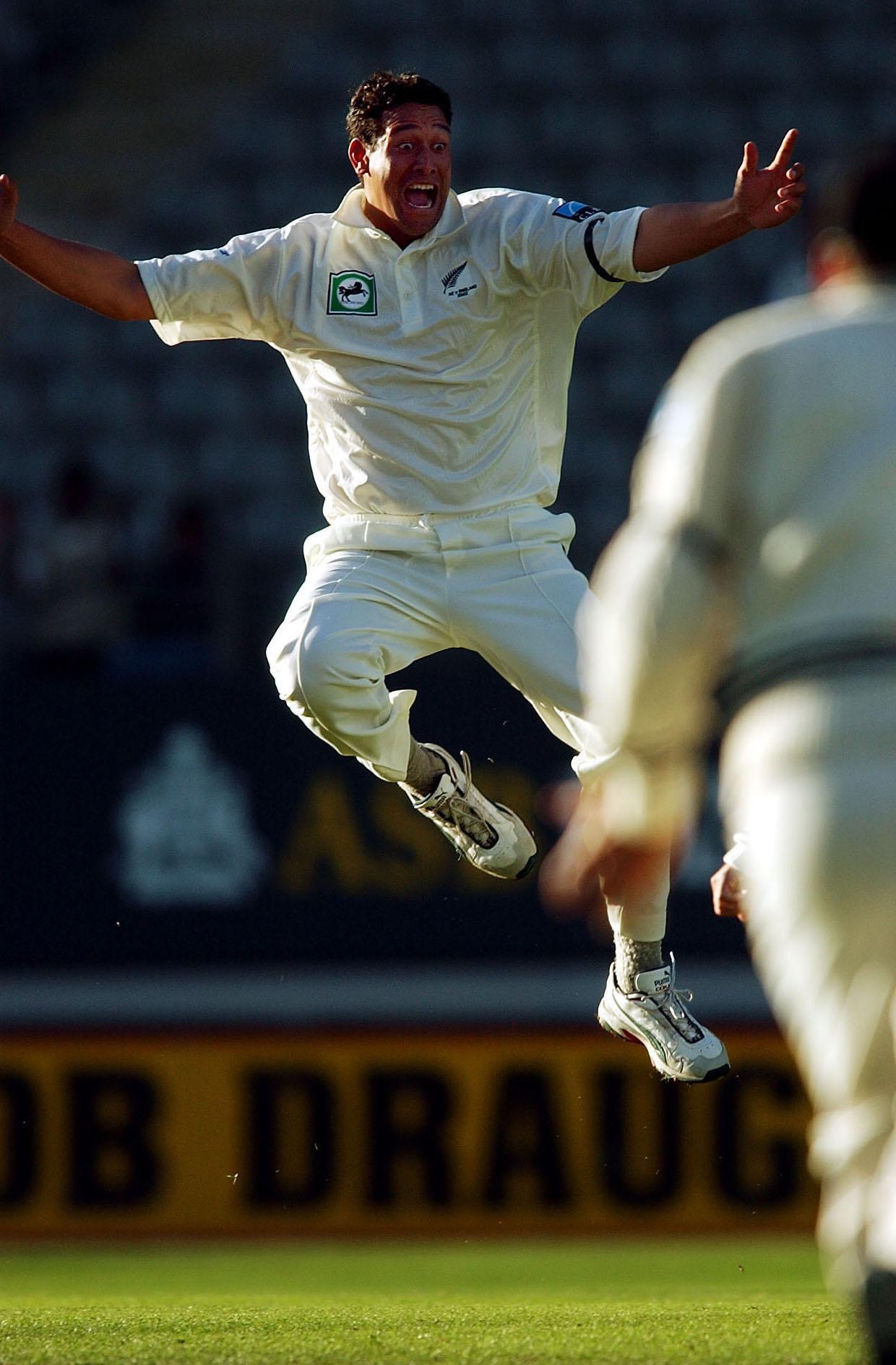 New Zealand’s Daryl Tuffey leaps off the ground as he celebrates taking the wicket of England’s Mark Butcher who was caught by Mark Richardson for a duck during the third day of the third and final test match at Basin Reserve, Auckland. PA Images / Alamy Stock Photo
